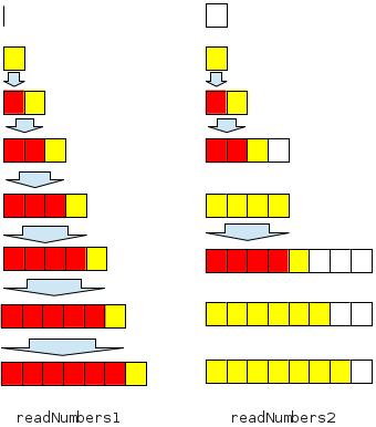 Unlike readNumbers1, readNumbers2 does not increase the array size by $1$ but doubles it. Therefore creation of a new array and copying of the contents of the old array into the new one is needed more rarely, at the cost of some memory being wasted on unused positions at the end of the array. The difference between the two algorithms is illustrated by the drawing below.