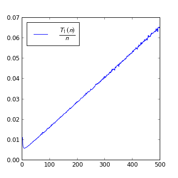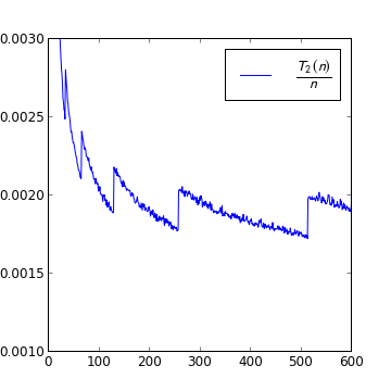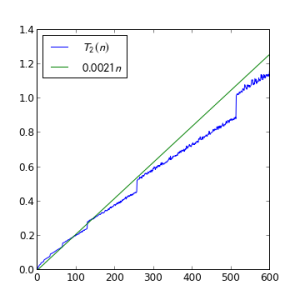 As said in the previous lesson, the figure confirms that we didn't make a mistake when calculating the theoretical upper bound: for example, from the figure one sees that $T_2(n) < 0.0021n$ if $n > 150$.