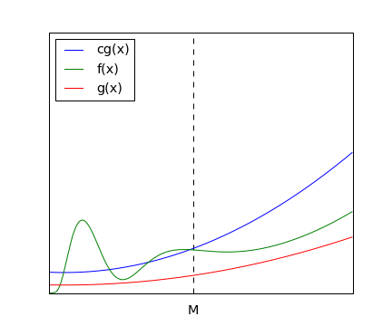 We will sometimes also use the phrase sufficiently large: when saying “$P(n)$ for all sufficiently large $n$”, we mean “there exists $n_0$ such that $P(n)$ for all $n \geq n_0$”. So the definition of Big Oh can be rephrased like this: $f \in O(g)$ if and only if there exists a constant $c \geq 0$ such that $f(n) \leq c g(n)$ for all sufficiently large $n$.