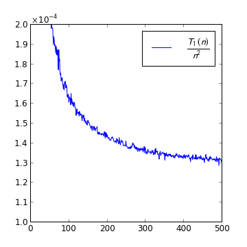 where $c$, $d$ and $e$ are some constants. The ratio is $\frac{T_1(n)}{n^2} = \frac{c}2 + (d-\frac{c}2)\frac1n + \frac{e}{n^2}$. Obviously we can make the last two terms as small as we like by choosing $n$ large enough. For example, there exist a number $n_0$ such that for all $n \geq n_0$, we have $(d-\frac{c}2)\frac1n < 0.1$ and $\frac{e}{n^2} < 0.1$. So $\frac{T_1(n)}{n^2} \leq \frac{c}2 + 0.2$ for sufficiently large $n$. Therefore, we have proven that $T_1 \in O(n^2)$. As the following diagram shows, measurements agree that ratio is indeed bounded: it appears that starting from $n \geq 50$ we have $\frac{T_1(n)}{n^2} < 2 \cdot 10^{-4}$.
